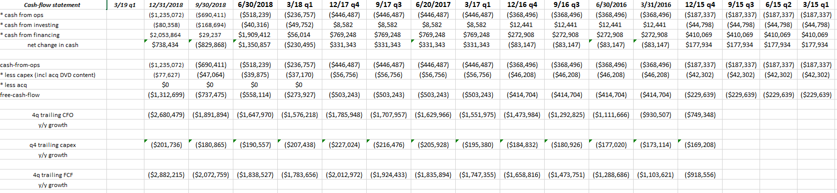 下图列出了自2015年以来奈飞的自由现金流数据,可以看到,自由现金流(FCF)一直为负,而且根据公司在2018年年报中的指引,2019年的自由现金流仍将为负。在AT&T公司下的HBO、迪士尼和苹果TV、亚马逊等的竞争压力下,资本投入还将增加,自由现金流将会一直承压。
