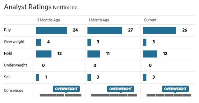 下图显示目前市场共有44位分析师跟踪奈飞,相比三个月前,将评级调整为卖出评级的分析师增加到了3位,尽管整体上不是绝对的改变,但是也显示了看多情绪的转弱。