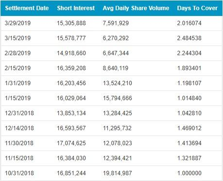 而从做空头寸上看,目前空头比率已经从一月份的1.01上涨到了2.01,虽然做空头寸有所下降,但是每日成交量从1580万下降到了760万股,导致空头比率上涨更为明显,如下图所示。
