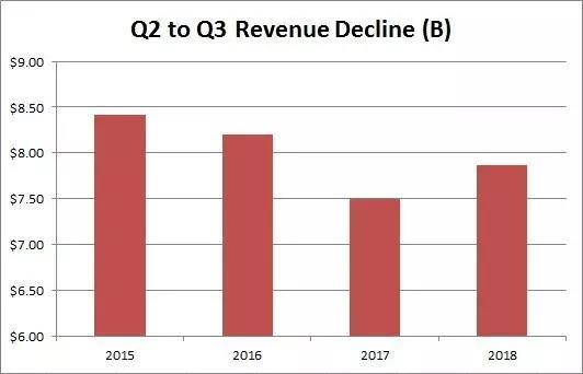 随着我们进入夏季,苹果进入了一年中的季节性的弱势时期。一般来说,在9月推出新系列手机之前,iPhone销量就开始下滑,其他具有类似发布时间线的产品也有相同的模式。在在下面的图表中,你可以看到在过去的四年中,从3月到6月的这个季度里,总收入平均下降了80亿美元。