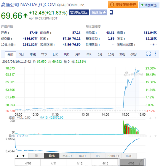 消息传出后,高通股价上涨逾20%,创自1999年以来最大单日涨幅。其市值因此增加了约145亿美元,至逾850亿美元。