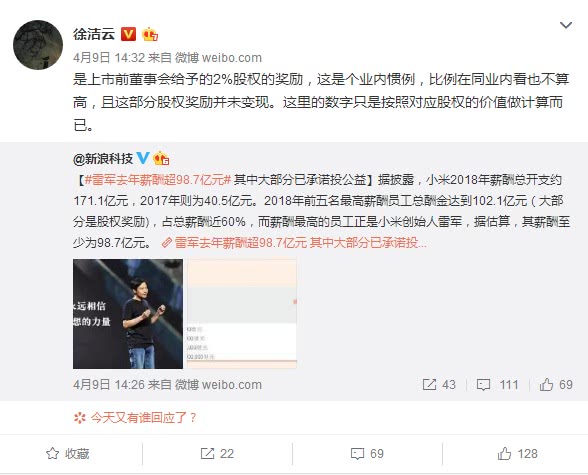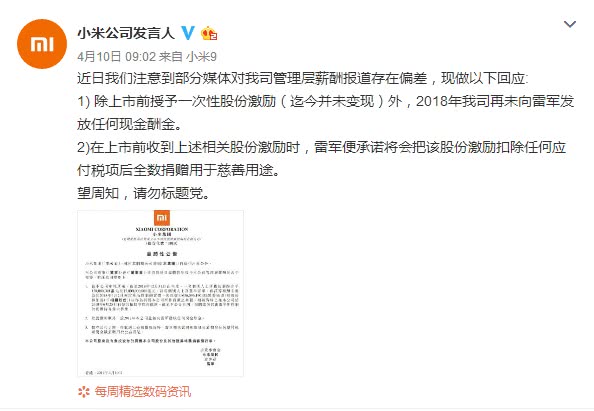 小米官方随后也做出了回应。4月10日早间,小米集团发布公告称:除股权薪酬外,2018年公司并无向雷军发布任何现金酬金。截至公告日期,相关股份仍由雷军所控制的实体持有并未售出。雷军承诺将相关股份于扣除任何应付税项后全数捐赠用于公益用途。