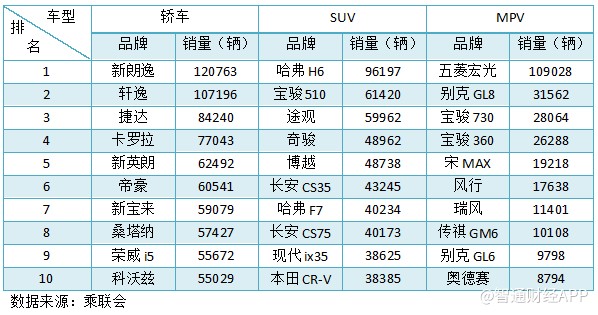 以下为轿车、SUV以及MPV销量排名前十的品牌车型: