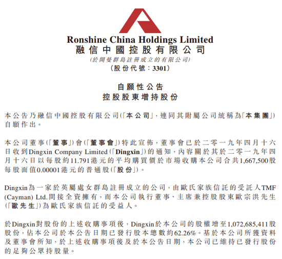 于Dingxin对股份的上述收购事项后,Dingxin于公司的股权增至已发行股本总数约62.26%。