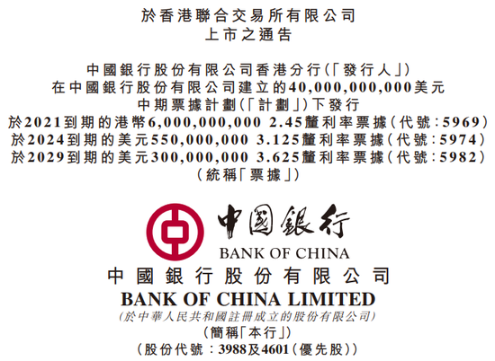 新浪港股讯 有关中国银行股份有限公司香港分行为发行人发行于2021到期的港币60亿,2.45厘利率票据(代号:5969);于2024到期的美元5.5亿,3.125厘利率票据(代号:5974);于2029到期的美元3亿,3.625厘利率票据(代号:5982)。