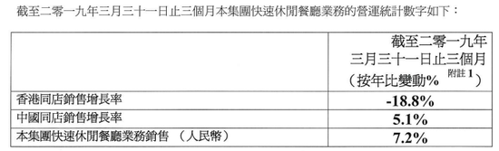 新浪港股讯 味千(中国)发布公告,截至2019年3月31日止3个月,集团快速休闲餐厅业务香港地区同店销售下滑18.8%,内地同店销售增长率5.1%,集团快速休闲餐厅业务销售同比增长7.2%。