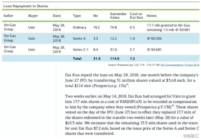 报告显示,戴琨于公司首次公开募股前一个月,2018年5月28日偿还贷款,转让3100万股,每股价值3.68美元,总计1.14亿美元(招股说明书第176页)。而在2018年5月14日,戴琨安排优信以589631元的费用向其授予1770万股股票,并在其授予时由公司记录为对其的补偿(招股书PF-138)。这些股票在首次公开募股(6月27日)当天授予,但实际上,在两周后(5月28日)以6530万美元价格替换了在转让中赎回的1770万股股票。根据已转让的A系列和C系列股票发行价,以此估计戴琨转让剩余1330万股股票的价格为72万元。