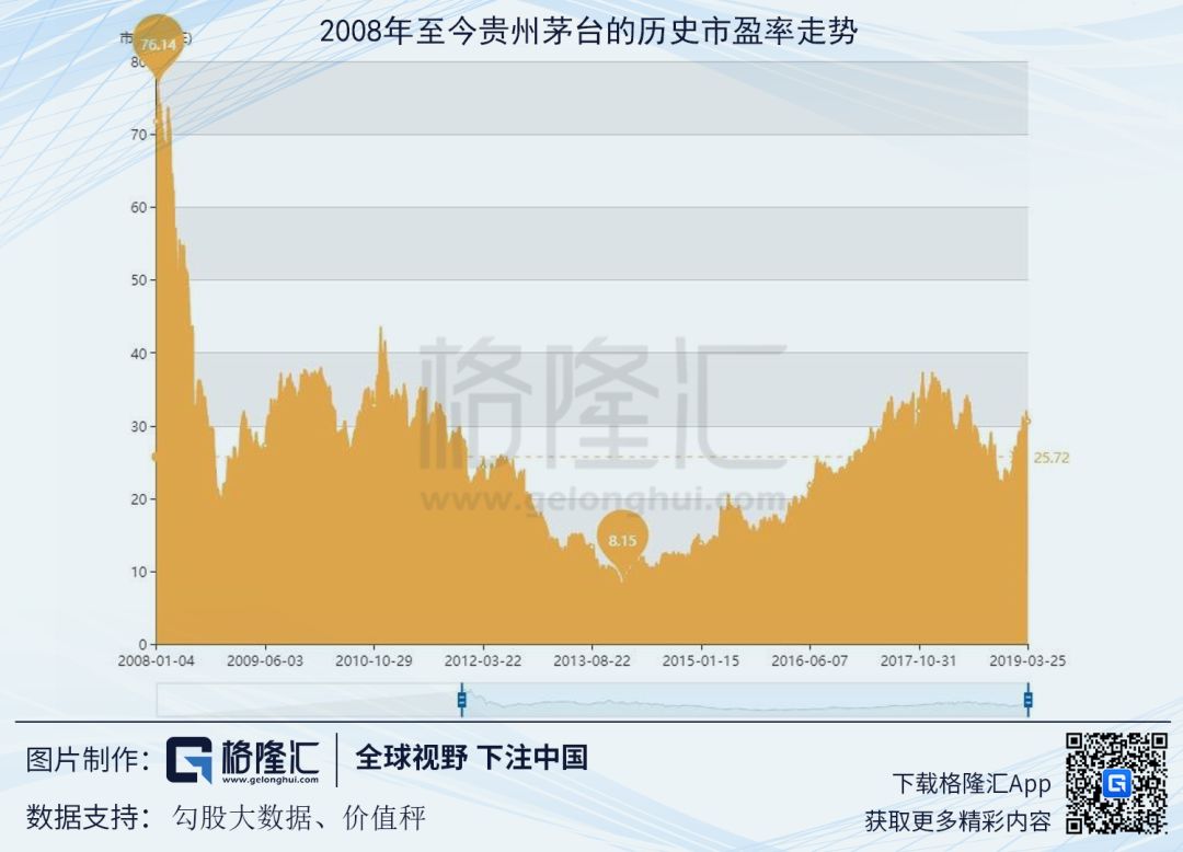 帕特多尔西认为,衡量一家企业品牌价值有效性的一个关键因素,就是看消费者是否愿意为它的品牌溢价买单,而显然,拥有定价权的茅台完全具备这一条件。由于茅台的业绩极为稳定且确定性较高,因此比较适合用传统的市盈率(PE)来估值: