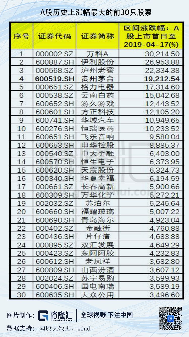 从历史表现看,贵州茅台自2001年登陆A股市场以来,18年间为股东创造了190多倍的高额回报。不过,据Wind数据显示,在它之上A股还有三家公司比它的涨幅更大: