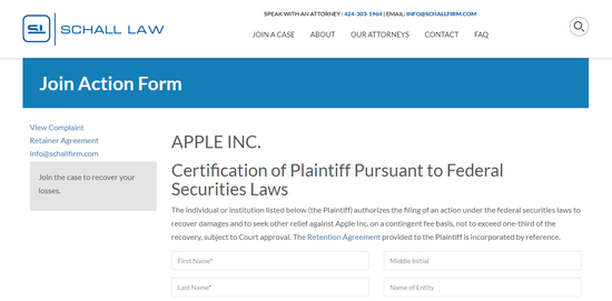 4月17日,美国Schall律师事务所正式向苹果公司提起一项集体诉讼,所指控的内容为该公司故意隐瞒与iPhone等产品销售有关的重要信息,构成证券欺诈。该律所正在其官方网页上公开征集投资者信息,并鼓励在诉讼期内(2018年11月2日至2019年1月2日)购买苹果公司股票的投资者参与集体诉讼。