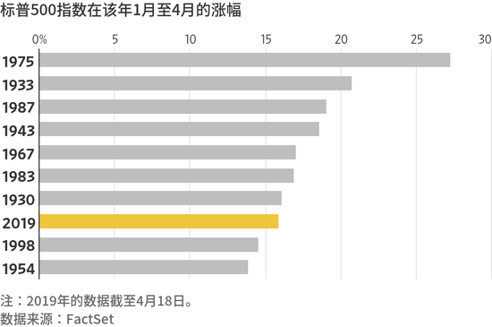 今年前四个月标普500指数累计上涨16%,目前距离历史高点不到30点,有望录得30多年来历史同期最好表现。该指数的飙升令许多华尔街银行感到意外,他们原本预计,股市从2018年底的动荡中反弹的速度会慢得多。