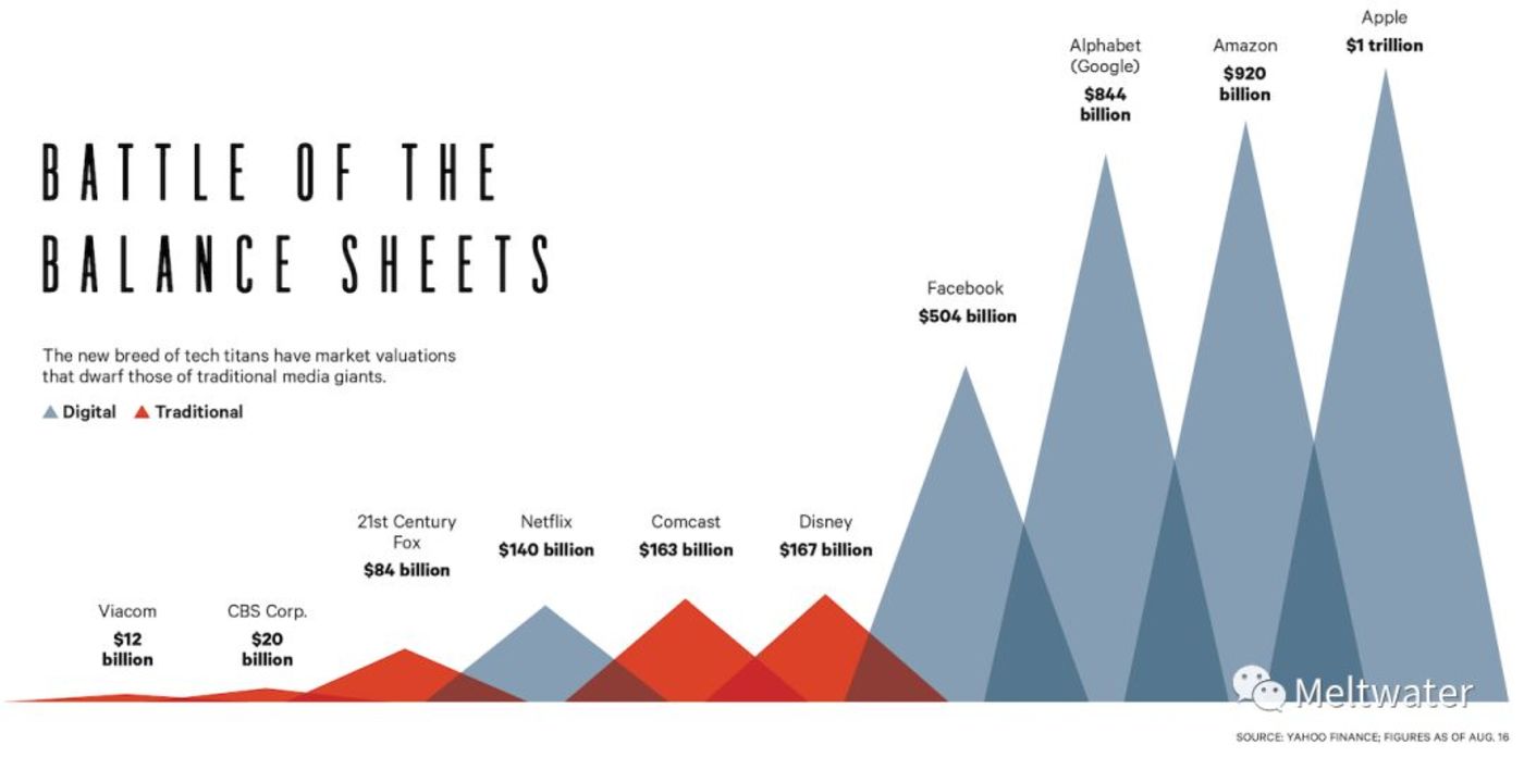 科技公司的支付能力远远超出了传统媒体公司,蓝色为科技公司,红色为传统媒体公司