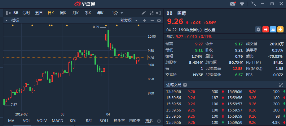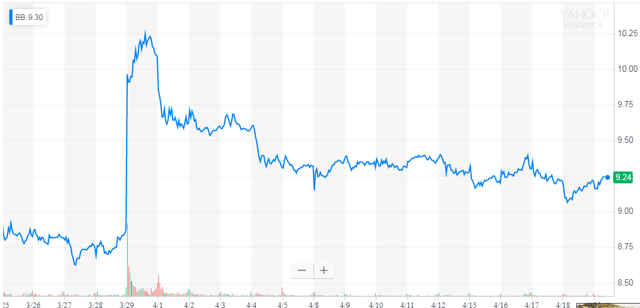 如上图所示,3月29日公司发布最新财报,股价从前一交易日收盘价8.88美元突破至10.29美元。然而,尽管科技股上涨至历史新高,黑莓股价却失去了涨势,上周跌至9.05美元。