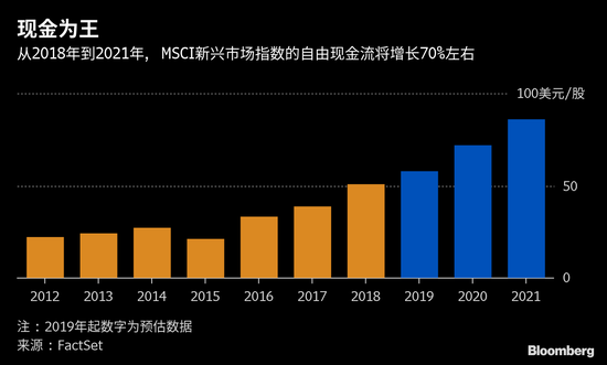邓普顿援引FactSet的预估表示,未来三年,MSCI新兴市场指数的每股自由现金流可能较2018年底增长70%左右。