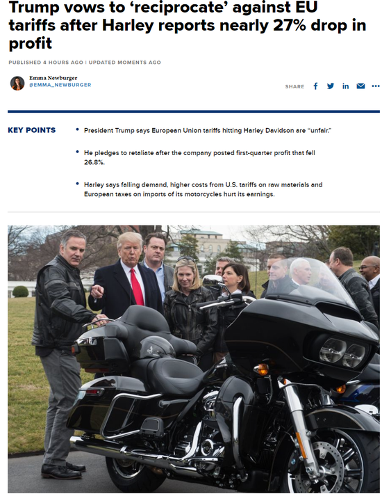 周二,美国总统唐纳德-特朗普似乎改变了对哈雷-戴维森(Harley Davidson)的态度,承诺对欧盟征收的“不公平”关税进行报复。哈雷戴维森第一季度利润下降近27%,部分原因是欧盟征收的关税。