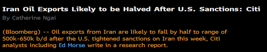 花旗分析师Ed Morse等人在研报中写道,美国本周收紧对伊朗的制裁后,伊朗的石油出口量可能下降一半,至50万-65万桶/天。