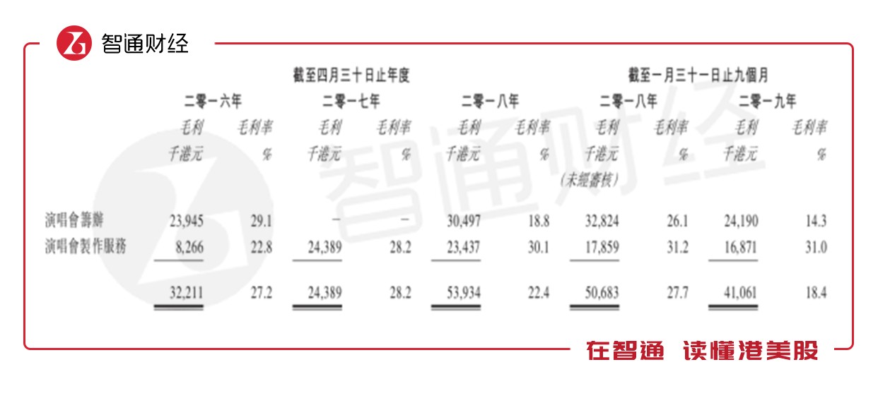 据艺能环球招股书数据,其演唱会筹办业务的毛利率在过去三年不断下滑。对此,艺能环球在招股书中解释为,因执行过程中产生的舞台开支及运营成本超出预算成本,导致了两场表演获得了边际亏损。此外,因门票销售收入低于预期也导致了七场表演产生了亏损。