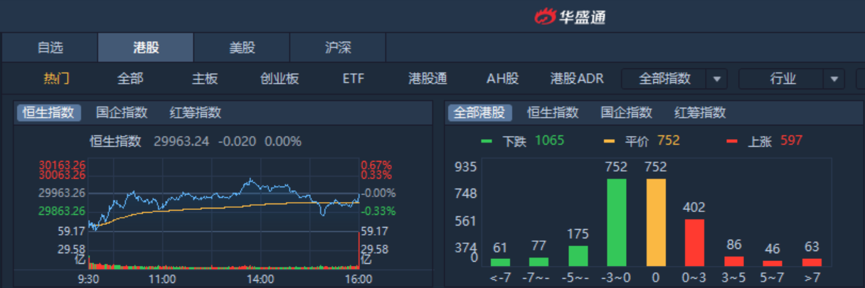 周二恒指早盘低开0.6%,一度站上三万关口,午后跳水后尾市走强,最终收跌0.02点,日成交额1071.78亿。国企指数跌0.32%,报11731.02点,红筹指数跌0.36%,报4640.76点。