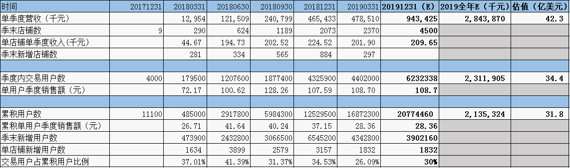 假设公司2019年年底门店数量达到4500,用单店铺单季度收入、单用户季度销售额或者累积单用户季度销售额可以分别预测公司2019年全年的收入情况,预计在21.35亿到28.44亿之间,不过,随着公司门店数量扩张,单店铺单季度收入可能难以保持持续上升,所以上述估计相对乐观。按照10倍市销率算,公司估值在31.8亿到42.3亿美元之间,相较B+轮29亿美元估值,增长也不少,而且B+也是在4月18日进行的,不到一个月估值就涨了10%以上。