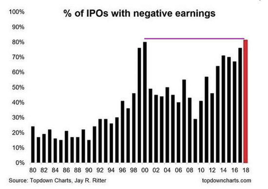 或许,保证金债券的使用者不希望像2000年互联网灾难时那样遭受损失。当时,80%的首次公开募股(IPO)都来自不盈利的公司。在2018年81%的首次公开募股的收益为负。