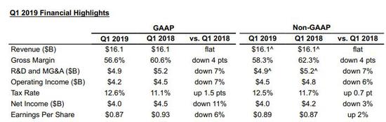 去年同期的数据显示,2018年一季度,英特尔经调整后的每股收益为87美分,同比增长32%;季度营收161亿美元,同比增长9%。这表明,英特尔今年一季度的营收同比持平,EPS增速也远逊于去年同期水平。