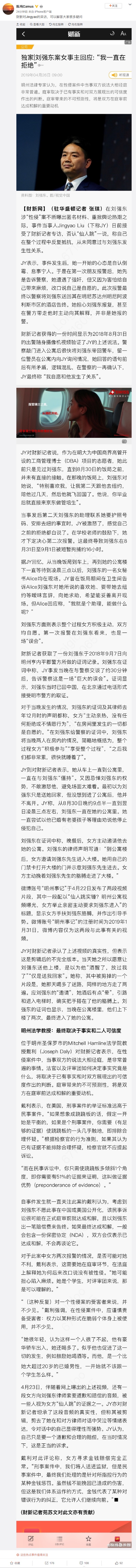 新浪科技讯 4月26日上午消息,微博账号为“陈纯Camus”的用户贴出财新网报道全文。报道中,刘强东案女事主接受媒体采访曝光,否认“仙人跳”一说。女事主称自己在整个过程中反复抵抗,从未同意过与刘强东发生性关系。