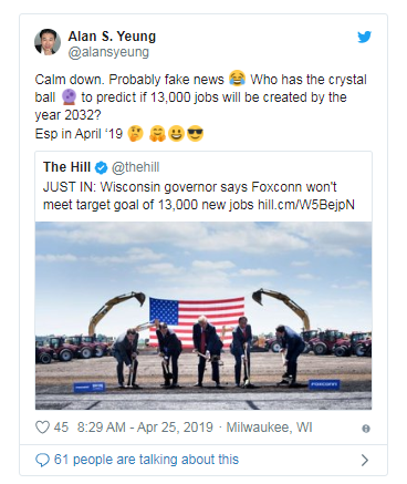 对于威斯康星州的富士康项目来说,这是一个动荡的两周。首先,威斯康星州州长托尼·埃弗斯表示富士康将履行承诺在该州雇用13,000名员工,并表示应该重新谈判该协议的内容。威斯康星州的共和党人迅速攻击埃弗斯,议会议长罗宾沃斯称他天真并指责他为该项目的失败的根源。杨兆伦在Twitter上发布了一个神秘的,配有表情符号的反驳: