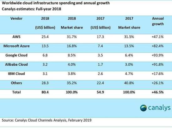 根据国际调研机构Canalys公布的2018年度全球云计算市场调研报告显示:2017年,全球云计算市场总规模达到550亿美元。2018年增长46.5%,市场总额冲到804亿美元。在这其中,亚马逊云计算服务营收超过250亿美元,约占全球云计算市场总额的31.7%,完胜微软(16.8%)、谷歌(8.5%)、阿里(4%)、IBM(3.8%)等其他玩家。