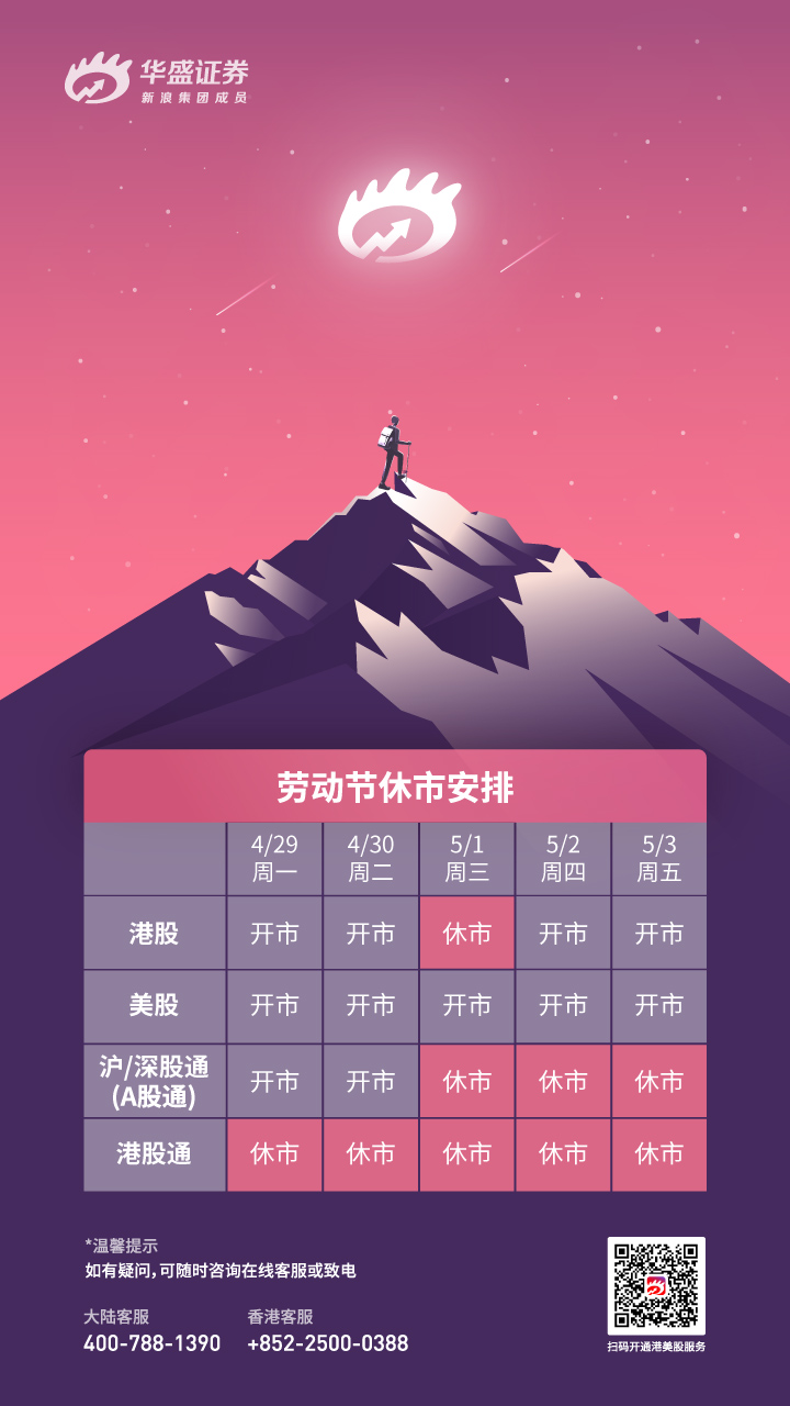 小编提醒:五一假期期间,A股市场连休三天,港股市场仅休市一天,而美股市场不受中国假日影响,正常开市,在欢快的假日里,别忘了留意股市的最新动向。提前祝各位五一快乐,投资顺利!