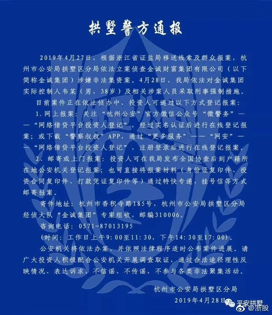 新浪财经第一时间联系金诚集团,拨打官网电话提示无此号码,新浪财经记者尝试联系港股上市公司金诚控股,对方电话显示无人接通请留言,且留言箱已爆。不过,大约下午6点,新浪财经从拱墅警方获悉:4月27日,浙江证监局接群众举报,杭州公安局拱墅分局依法立案侦查金诚集团涉嫌非法集资案。4月28日,拱墅分局对集团实控人韦某及相关涉案人员采取刑事强制措施。