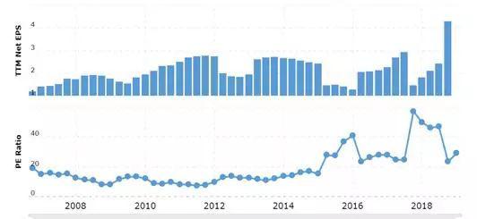 尽管这看起来很高,但上面图表显示,与历史上的往绩市盈率相比,微软金融服务公司的股价并没有被严重高估。在2015-2016年的部分时间以及2018年的大部分时间里,微软的市盈率远远高于24倍的历史市盈率,去年甚至超过了40倍。