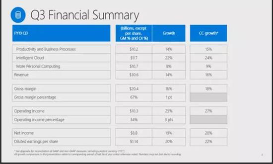 微软第三季度营收同比增长14%,其中增长最快的是微软智能云业务。