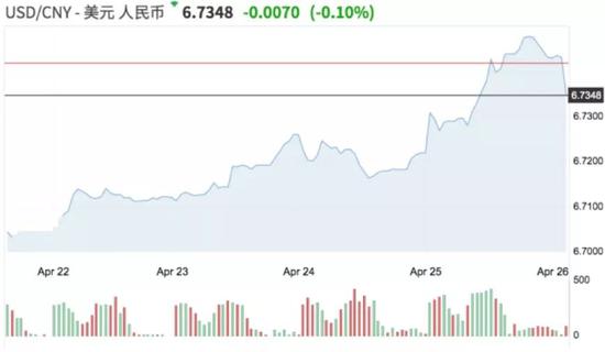 4月24日,美元指数收于98.1,创下2017年5月以来和触底88后重新走强以来的最高水平。3月20日以来,美元指数累计上涨了2%。与此同时,亚洲股市开始调整,人民币波动率也有所加剧,25日一度跌近200基点(bp),目前美元/人民币稳定在6.73上下,仍可谓是偏强的水平。