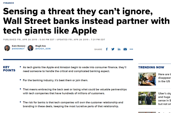 CNBC指出,大银行可能不得不习惯配角的身份。随着科技巨头开始涉足消费金融领域,银行业面临着两难境地:要么退居二线,要么失去与拥有数亿客户的科技巨头的宝贵合作伙伴关系。