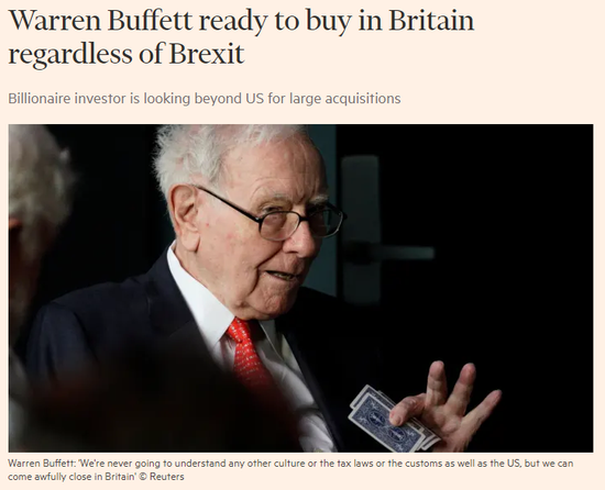 巴菲特在英国退欧之前对英国表示了大力支持,他在接受英国《金融时报》采访时说“准备明天在英国买点东西”。