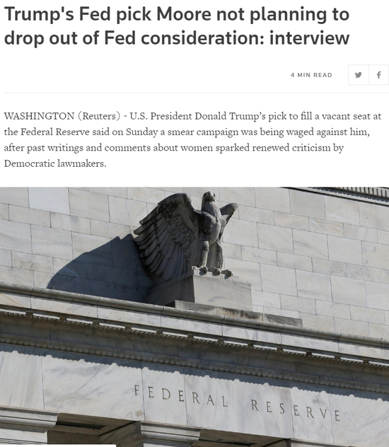 美国总统特朗普提名的美联储理事人选斯蒂芬-摩尔(Stephen Moore)周日表示,针对他的诽谤活动正在有组织地展开。他表示,如果他成为累赘,他将选择退出提名,但他认为事情不会发展到那种地步。此前,民主党议员对其以往有关女性的文章和言论再次提出批评。