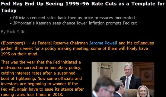彭博社指出,相比之下,现在和1995-1996年之间有很多相似之处。25年前,美国和全球经济增长也在放缓。而1995年7月、12月和1996年1月,美联储曾三次降息,理由是物价压力有所缓解。如今的政策制定者更加关注低水平的通胀,而且毫不掩饰他们希望通胀率更高。