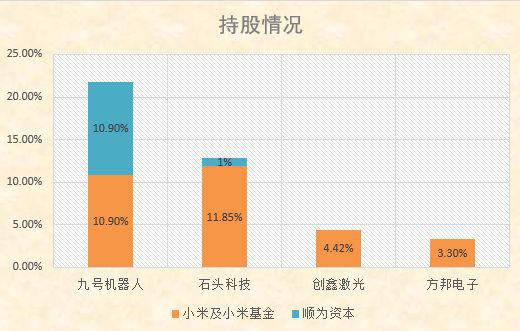 主营业务为智能清洁机器人的石头科技,和小米关系密切。小米集团在2014年3月投资石头科技,顺为资本在2016年3月跟进投资。目前小米旗下基金持股11.85%,为第二大股东,顺为资本持股1%。小米不仅是石头科技的股东,同时也是重要客户和分销渠道。在2018年推出自有品牌之前,石头科技的收入中超过九成来自小米。
