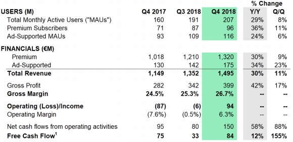 其次,用户方面超预期,Q4月活达2.07亿,同比增速为29%,比分析师一致预期高400万。其中付费订阅用户总数9600万,比分析师预期多100万,同时每用户平均贡献收入ARPU为4.89欧元,也好于分析师预计的4.86欧元。广告相关的用户月活为1.16亿,同样超出分析师预计的1.102亿。