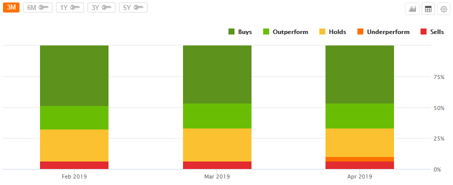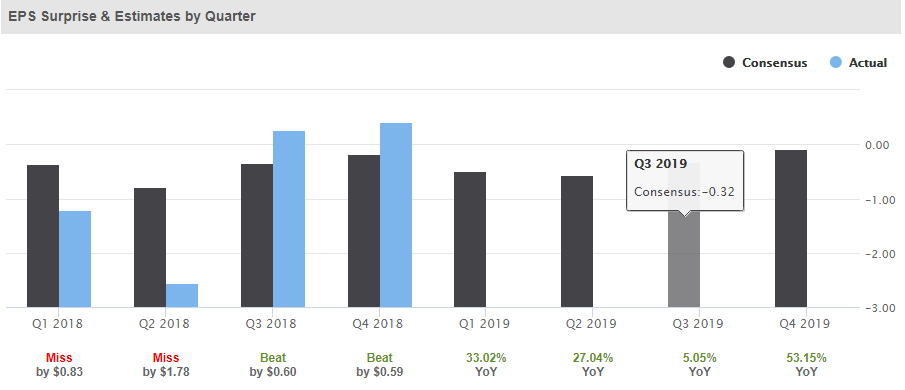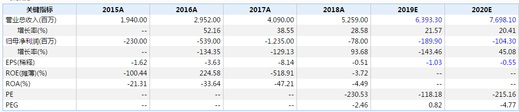 上季公司给出的19财年展望为:营收63.5亿至68亿欧元,一致预期67亿欧元。基于万德数据,半年内机构预测,分析师预计19年营收63.93亿欧元,同比增速为21.57%。预计年内归母净亏损扩大至1.9亿欧元,同比大幅下滑143.5%,去年同期则为同比增长93.68%,相当于达到近三年的最大亏损,稀释EPS一致预期为亏损1.03欧元。单个季度,公司预计营收同比增19%至36%达13.5亿至15.5亿欧元。