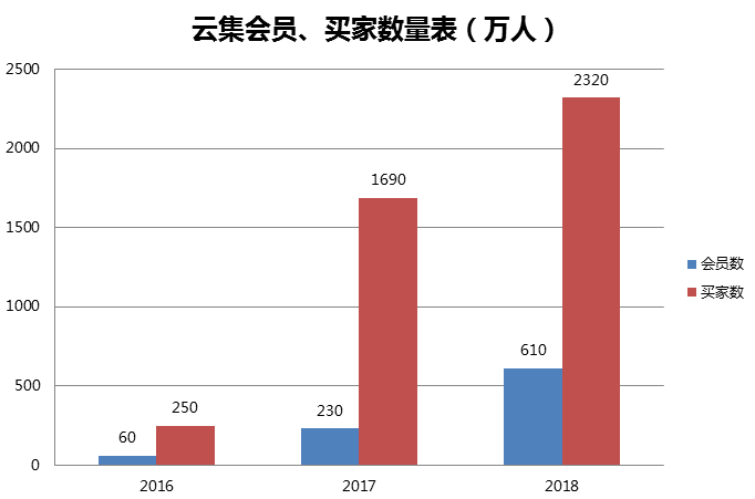 如招股书上所言,独特的会员制电商模式,让云集在短短的三年时间,无论是会员数量、卖家数量乃至站内交易总额(GMV)都得到了一个质的飞跃。像2016年云集会员数量仅60万,到2018则增长了超9倍,到了610万人。2016年买家数量则250万增长到2018年的2320万人,增长幅度达828%!GMV由2016年的人民币18亿元增加428.1%至人民币96亿元。