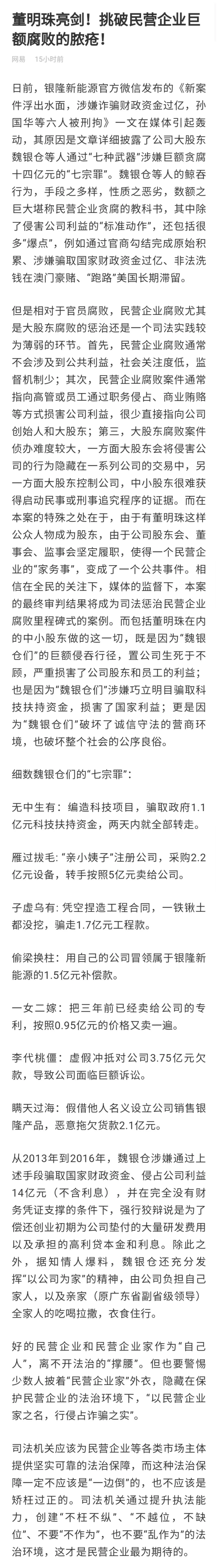 媒体报道《董明珠亮剑!挑破民营企业巨额腐败的脓疮!》原文如下: