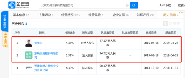 4月29日上午消息,企查查数据显示,北京知识印象科技有限公司4月28日发生股东变更,刘强东以及其控股公司东辰投资控股有限公司退出股东行列,该公司曾于2015年7月,获得1000万美元的A轮融资,由好未来领投,刘强东、章泽天和天使投资方联想之星跟投。