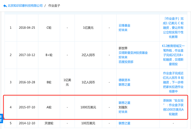 公开资料显示,2018年4月,作业盒子宣布完成1亿美元C轮融资,由云锋基金领投,好未来等机构继续跟投。2017年10月,还曾获得BAI(贝塔斯曼亚洲投资基金)领投的2亿元人民币B+轮融资。