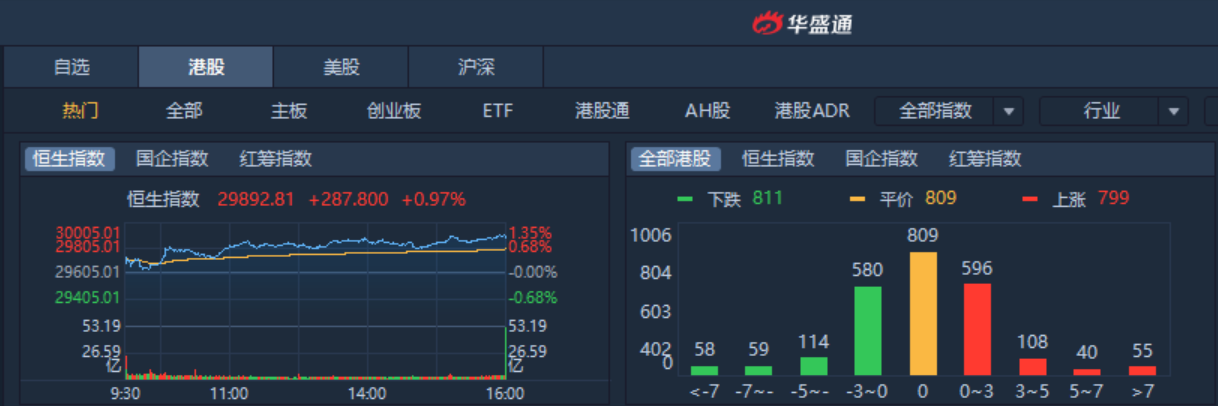 周一恒指早盘高开0.43%,收盘涨287.8点,涨幅0.97%,报29892.81点,全日成交额为747.2亿。国企指数涨1.11%,报11638.18点,红筹指数涨0.83%,报4620.34点。