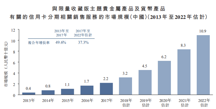 而对于公司主要收入来源——贵金属和纪念币销售领域,该细分市场仍处于早期发展阶段,由于贵金属特别是黄金是一种资产保值产品的观念正在逐渐普及,2017-2022年复合年增长率也在37.3%的高水平。