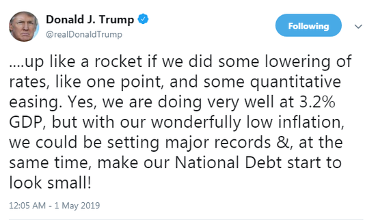 在推文中,特朗普批评美联储在美国“通货膨胀率极低”期间“不断提高利率”。