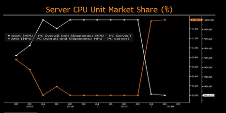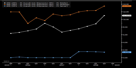随着AMD新产品Ryzen和EPYC处理器的发布,公司市占率正不断扩大,有望进一步蚕食对手英特尔的份额。Digitimes预计截止到2020年底,英特尔的市场份额将下降到90%以下,AMD将获得英特尔的部分市场份额。彭博最新数据显示,随着公司供应芯片的chrome笔记本和其他笔记本上市,公司将有望获得最大的移动CPU份额增幅。服务器处理器方面,相比新品开发快速、价格合理的AMD,英特尔的进展受制于下游云开支紧缩及缓慢的技术更新,从第二个图可以看出,AMD市占率有突破性的提升,蚕食英特尔的大笔份额。