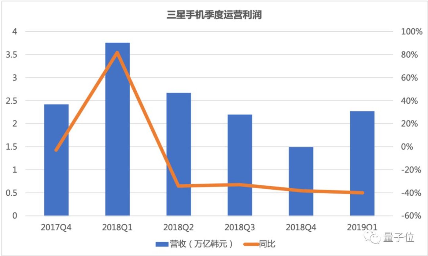 三星手机已经连续第四季度,出现运营利润同比下降,从2018年二季度迄今,每个季度的同比降幅分别是:-34%、-33%、-38%、-40%。