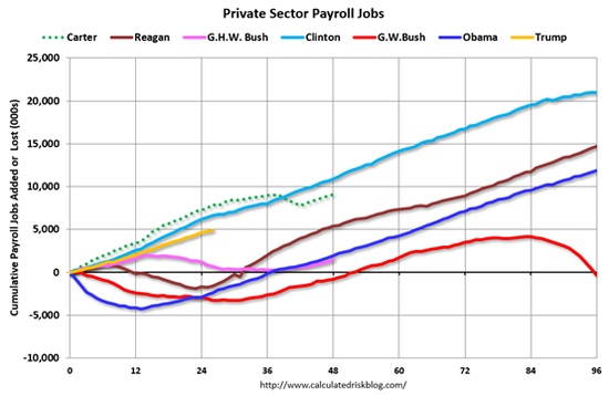 在克林顿(浅蓝线)、里根(深红线)、卡特(绿虚线)、老布什(浅紫线)、奥巴马(深红线)总统的任内,私人部门就业人数出现增长,分别增长了2,097.9万、1,471.4万、903.9万、151.1万、1189万。